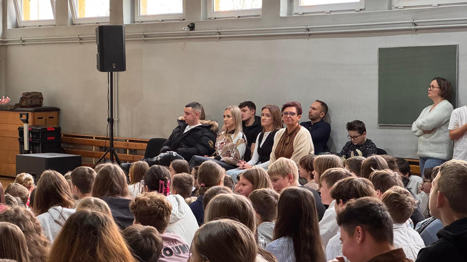 Uczniowie wysłuchali krótkiej prelekcji na temat hejtu i przemocy rówieśniczej przygotowanej przez przedstawicielki Ośrodka Interwencji Kryzysowej oraz Miejskiego Ośrodka Pomocy Społecznej, krótką rozmowę na ten temat z młodzieżą szkolną przeprowadził Prezydent Miasta Siemianowice Śl- pan Rafał Piech.