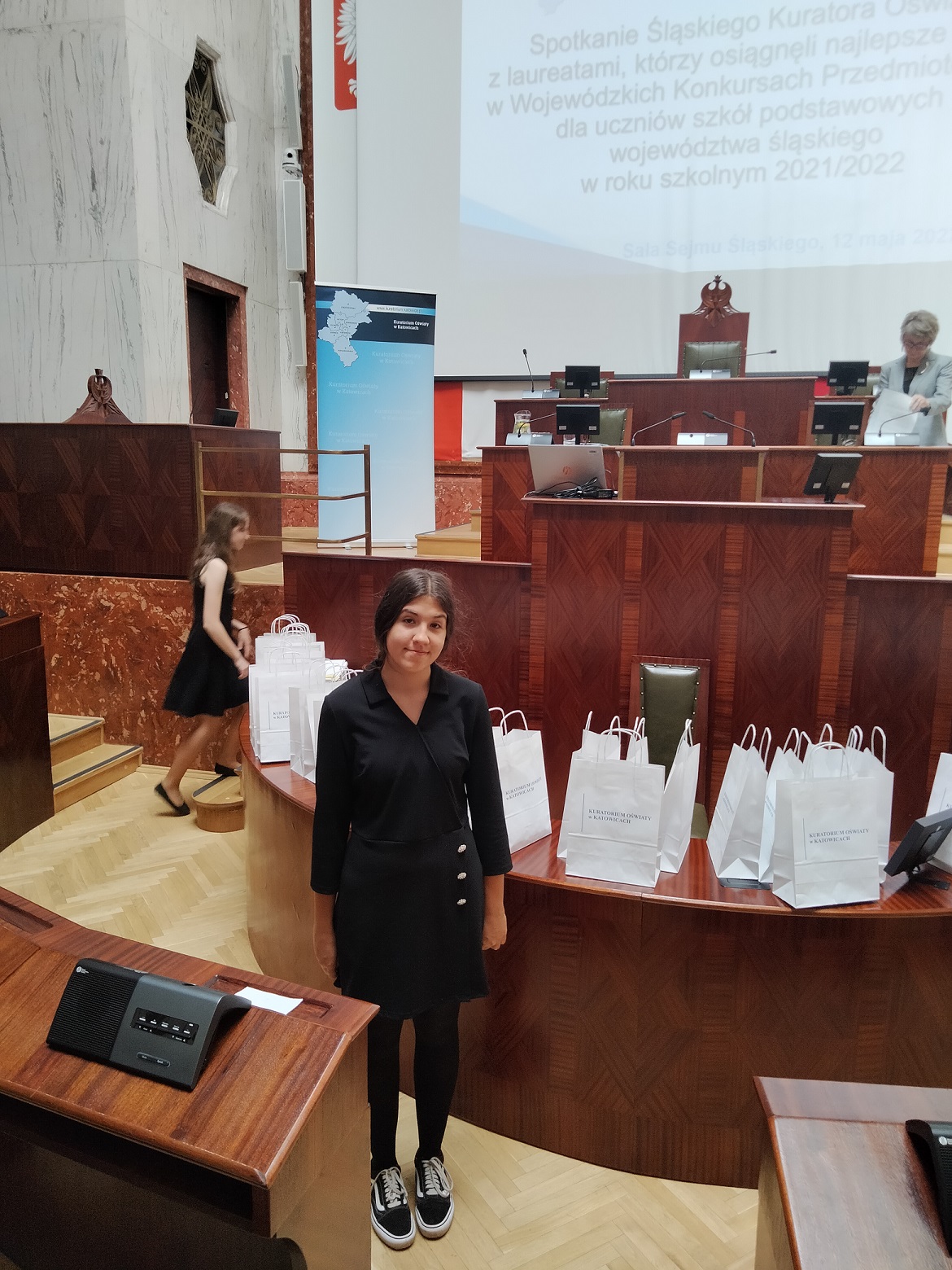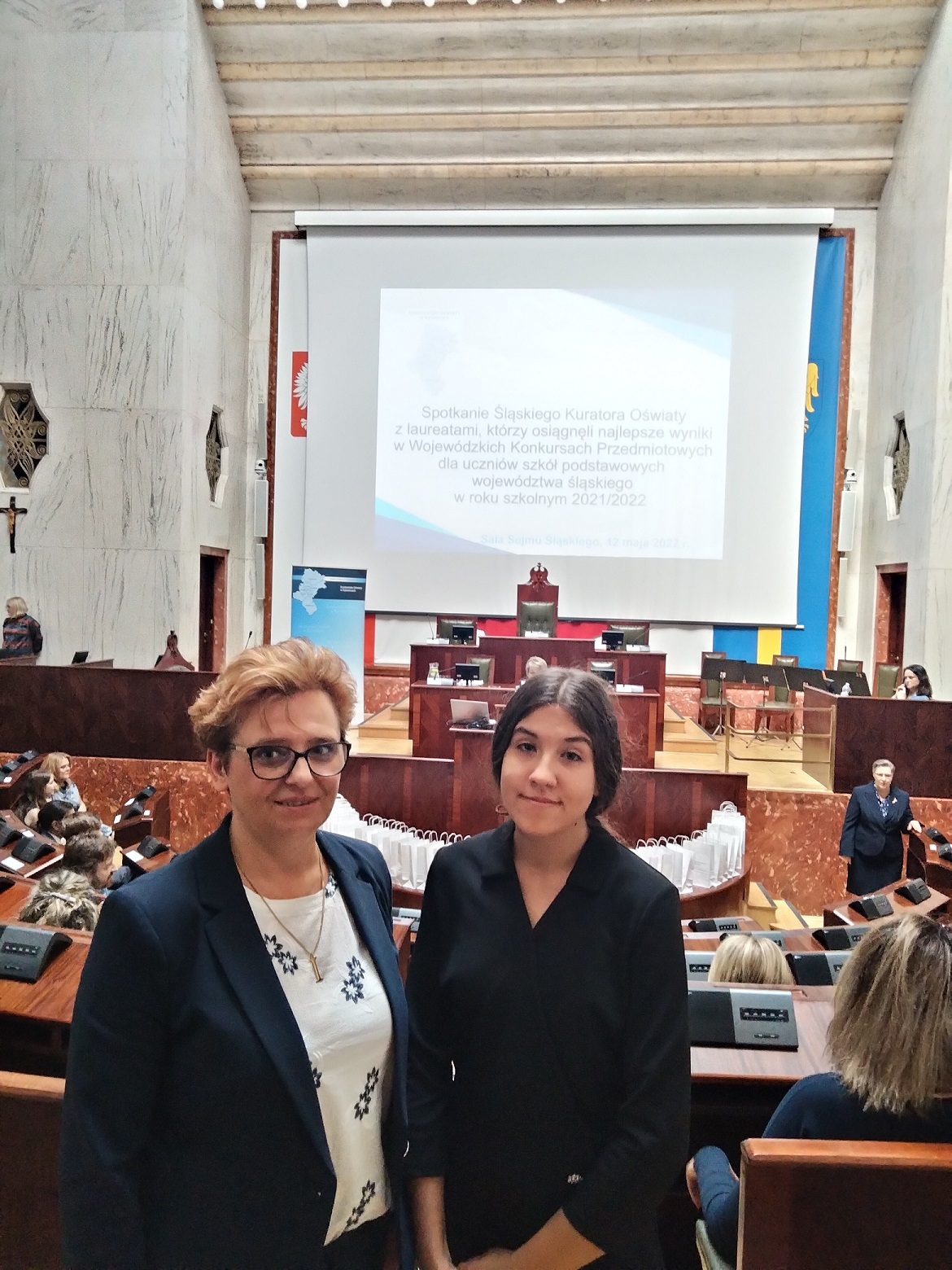 W czwartek 12 maja 2022r. uczennica klasy 8c Victoria Schwinge wraz z dyrektorem szkoły wzięła udział w uroczystości wręczenia przez Panią Urszulę Bauer dyplomów gratulacyjnych i nagród uczniom, którzy osiągnęli najlepsze wyniki w Wojewódzkich Konkursach Przedmiotowych dla uczniów szkół podstawowych województwa śląskiego w roku szkolnym 2021-2022. Spotkanie odbyło się w przepięknej Sali Sejmu Śląskiego, było bardzo podniosłe i miłe. Okazało się, że Victoria jako dwukrotna Laureatka stanęła w gronie 41 najlepszych z najlepszych uczniów województwa.