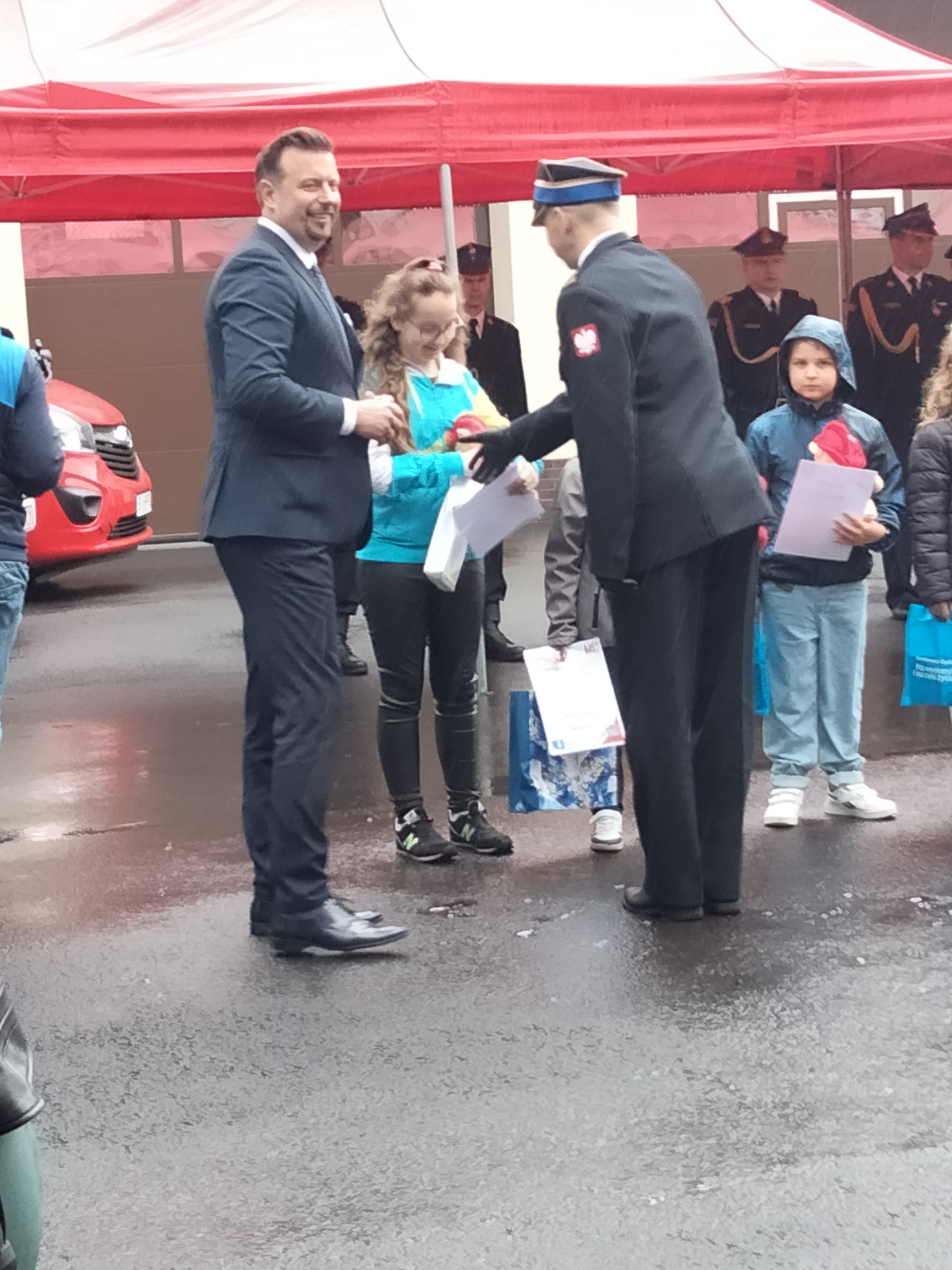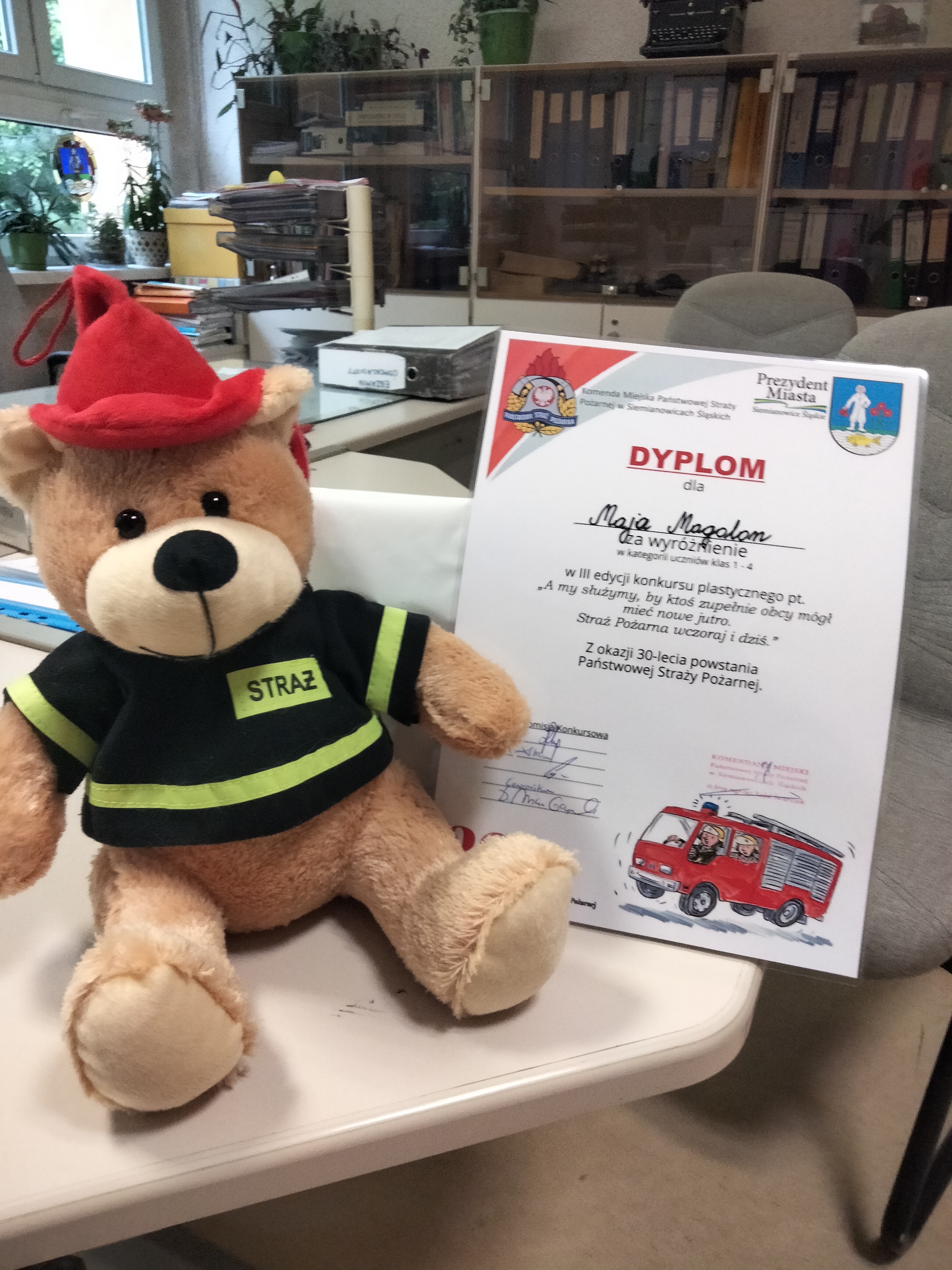5 maja 2022r. podczas obchodów z okazji Dnia Strażaka oraz 30- lecia funkcjonowania Państwowej Straży Pożarnej w Siemianowicach Śl. odbyło się uroczyste rozdanie dyplomów dla nagrodzonych uczniów siemianowickich szkół w konkursie plastycznym pt. „A My służymy, by ktoś zupełnie obcy mógł mieć nowe jutro, Straż Pożarna wczoraj j dziś”. Dwie uczennice naszej szkoły Maja Magolon – 3a i Zuzanna Wróblewska – 7a odebrały z rąk Pana Prezydenta Miasta Siemianowice Śl. Rafała Piecha i Pana Zastępcy Komendanta Miejskiego PSP w Siemianowicach Śl. Grzegorza Pyrchla swoje nagrody. Gratulujemy!