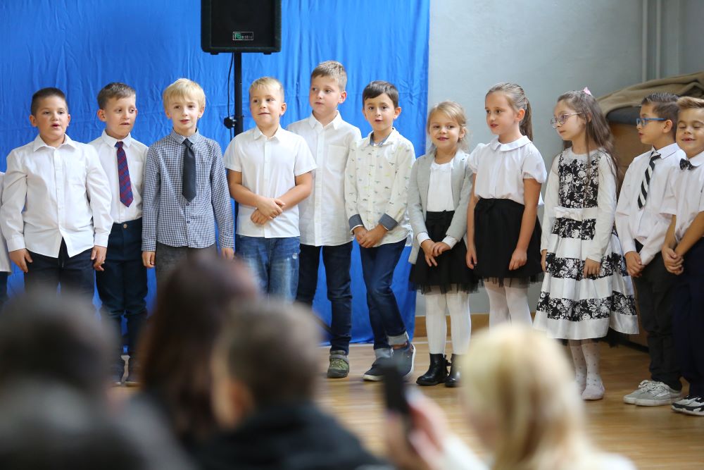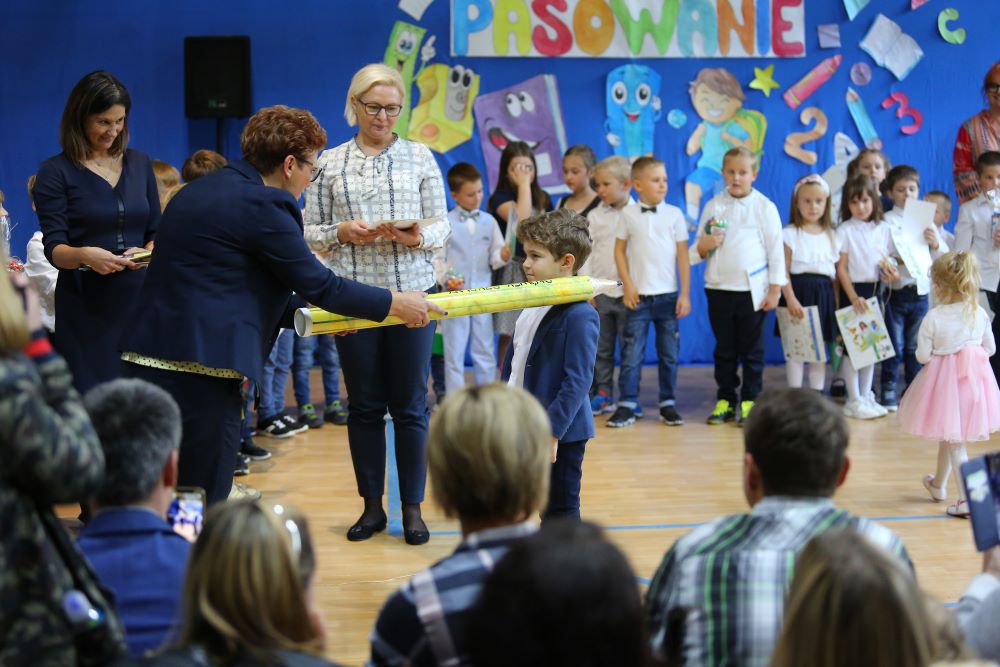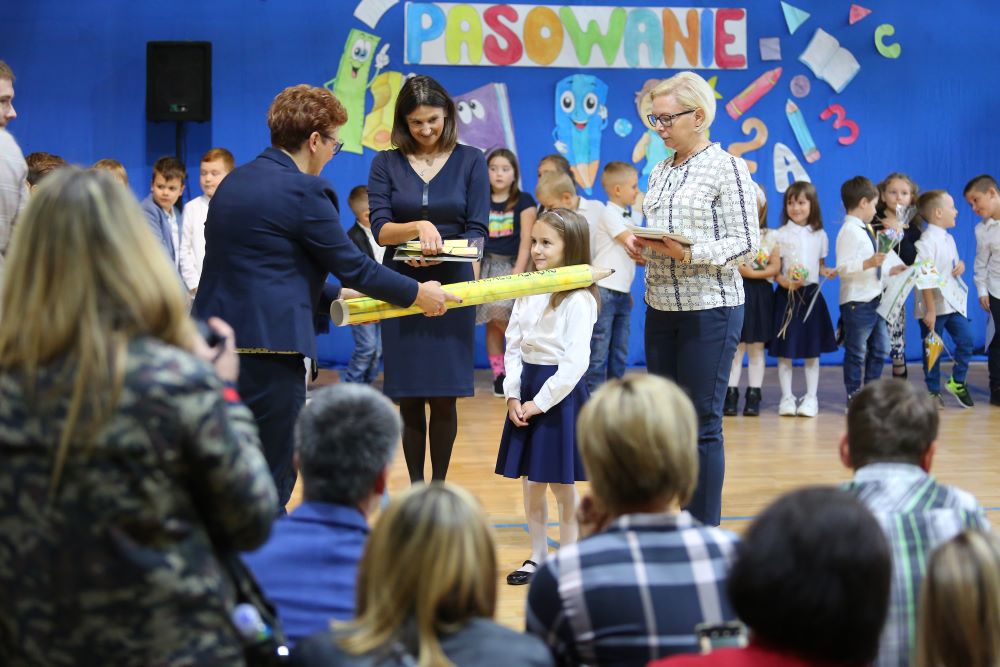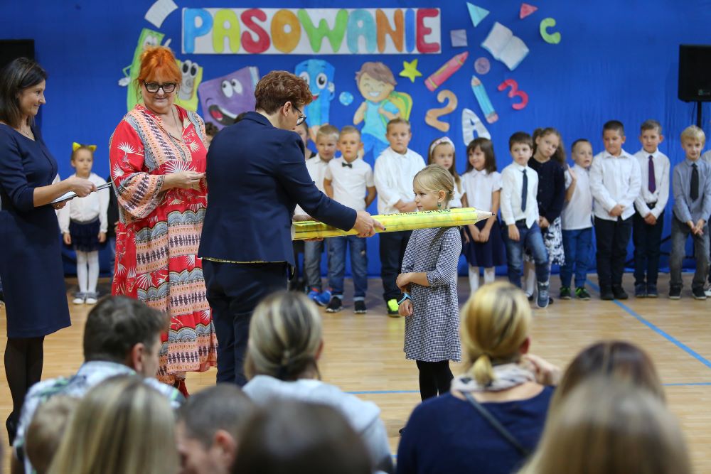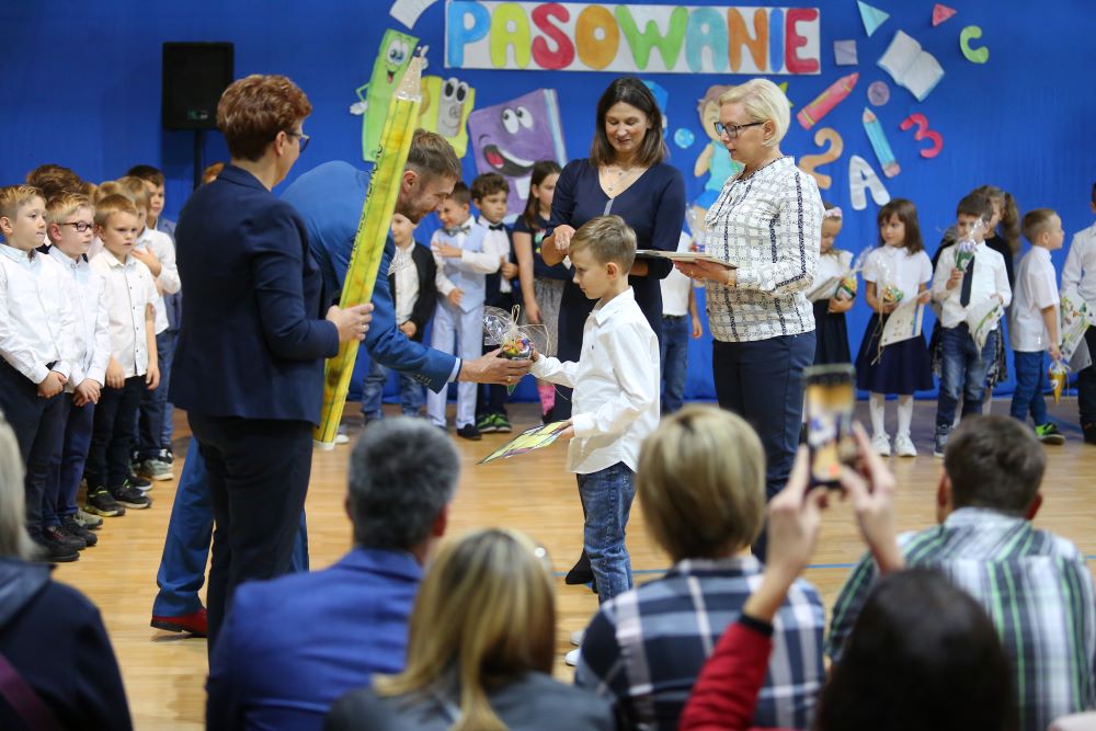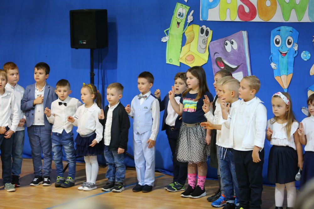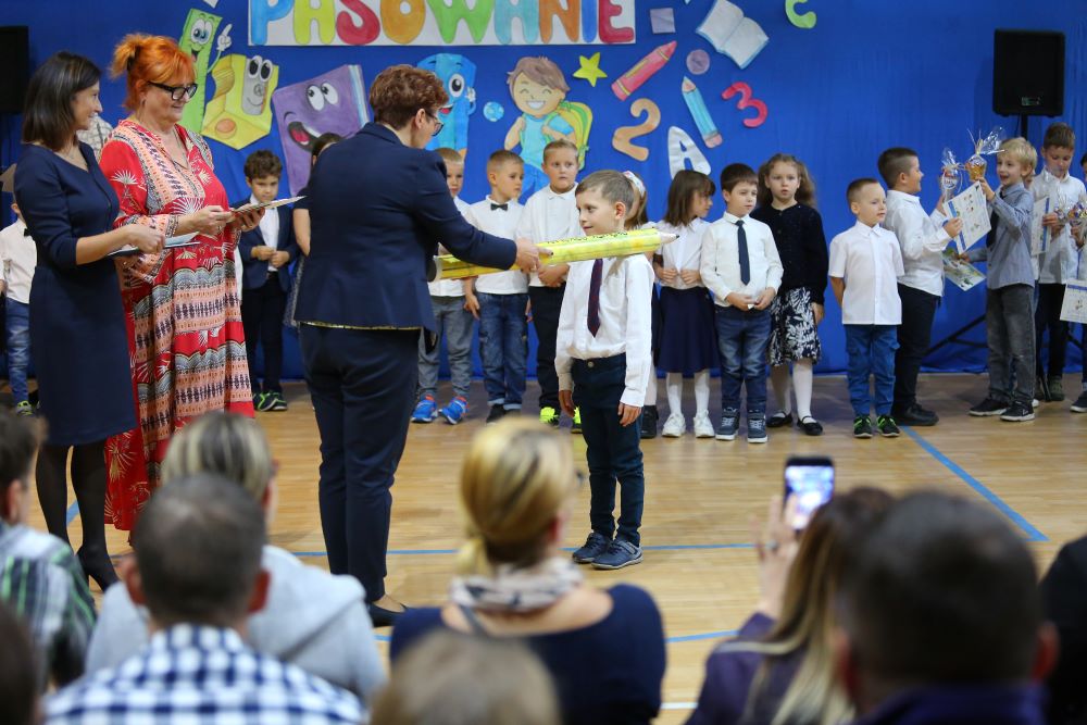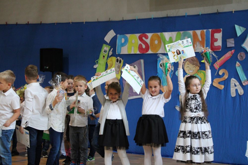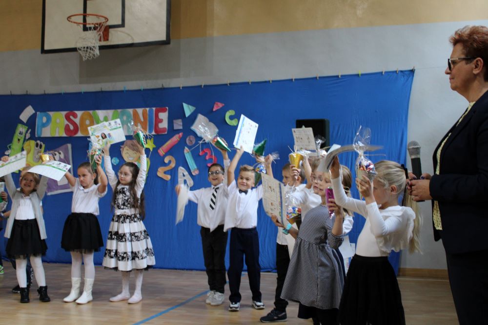 Uroczystość rozpoczęła się od powitania naszych bohaterów przez Dyrekcję szkoły oraz koleżanki i kolegów z klas czwartych. Starsi uczniowie życzyli sukcesów w zdobywaniu wiedzy oraz przekonywali o tym, że szkoły nie trzeba się bać, a także oferowali swoją pomoc w każdym trudnym momencie.