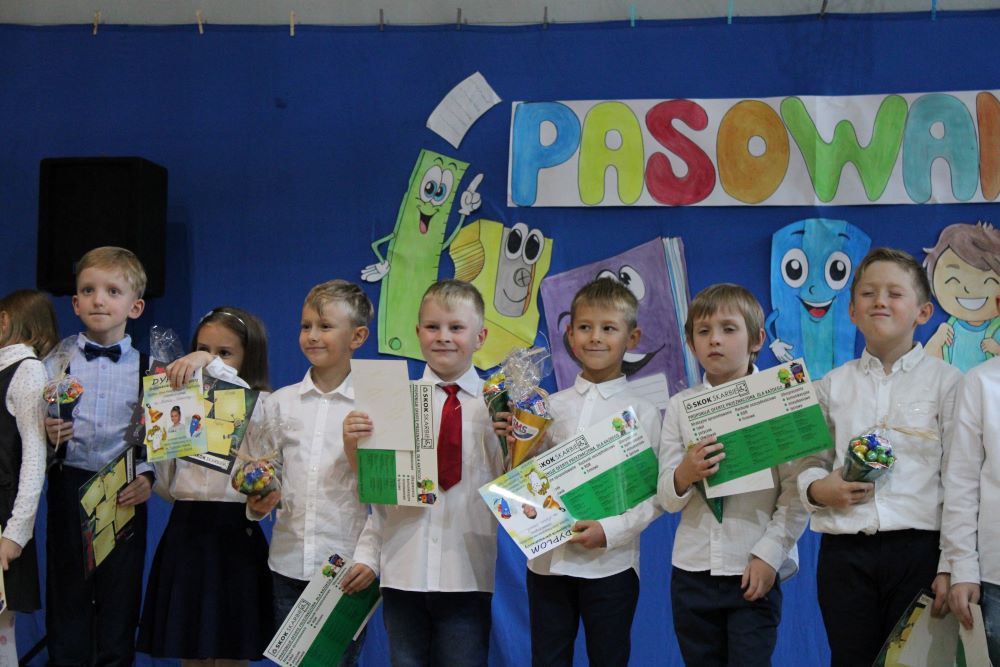 Następnie pierwszoklasiści udowodnili, że są godni przyjęcia w poczet „Szóstkowiczów”. Zrobili to za pomocą wierszy i piosenek. Po części artystycznej, dzieci nagrodzone oklaskami, przystąpiły w wielkim skupieniu do ślubowania. Równie uroczysty charakter miało pasowanie uczniów. Dyrektor szkoły Izabela Kurzyca, w obecności Wicedyrektor Aurelii Tomaszewskiej, gości ze stowarzyszenia SMS – pani Alicji Piech i pana Jana Nycz oraz wychowawców klas Marii Mozler i Barbary Knop, pasowała na uczniów SP 6 indywidualnie dotykając jego ramienia magicznym ołówkiem. Każdy z pierwszaków otrzymał pamiątkowy dyplom i słodki róg obfitości ufundowany przez stowarzyszenie SMS.