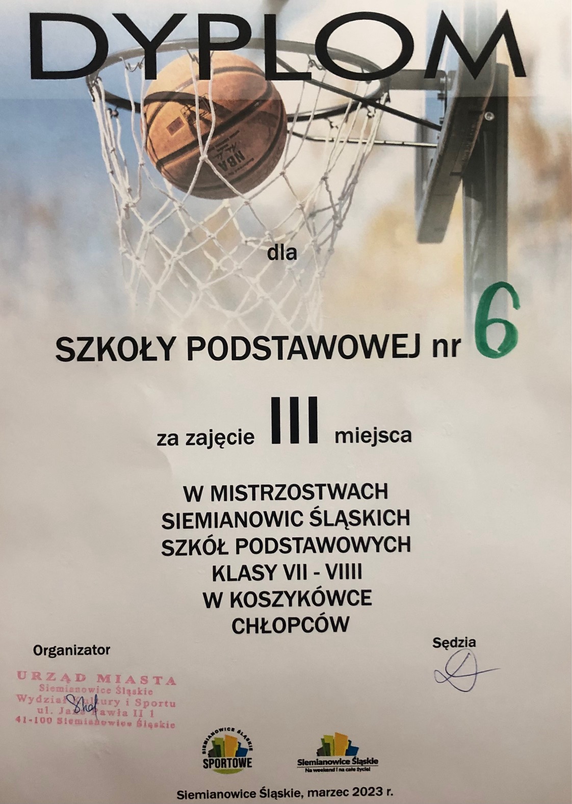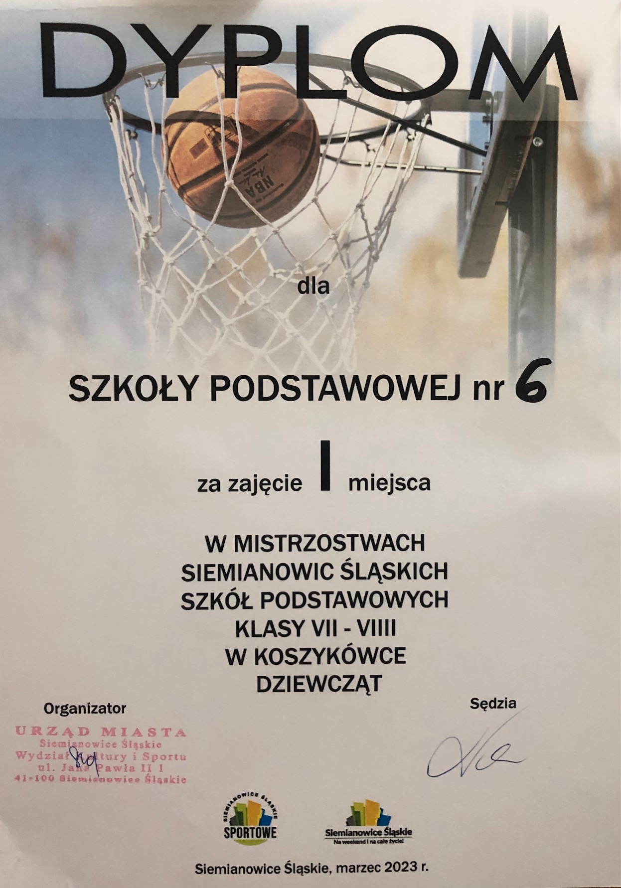 Nasza szkoła Mistrzem Siemianowic Śląskich w Koszykówce. Drużyna uczennic klas ósmych w składzie: Emilia Nos, Marta Wyrzykowska, Lena Kowalczuk, Lena Górska, Paulina Stanek, Oliwia Cisek, Kinga Nazaruk, Dominika Brocka, Nadia Woźniak pokonała w finale wysoko zawodniczki SP 1 oraz ZSS. Z niecierpliwością czekamy na dalsze mecze naszych dziewcząt w zawodach rejonowych.?