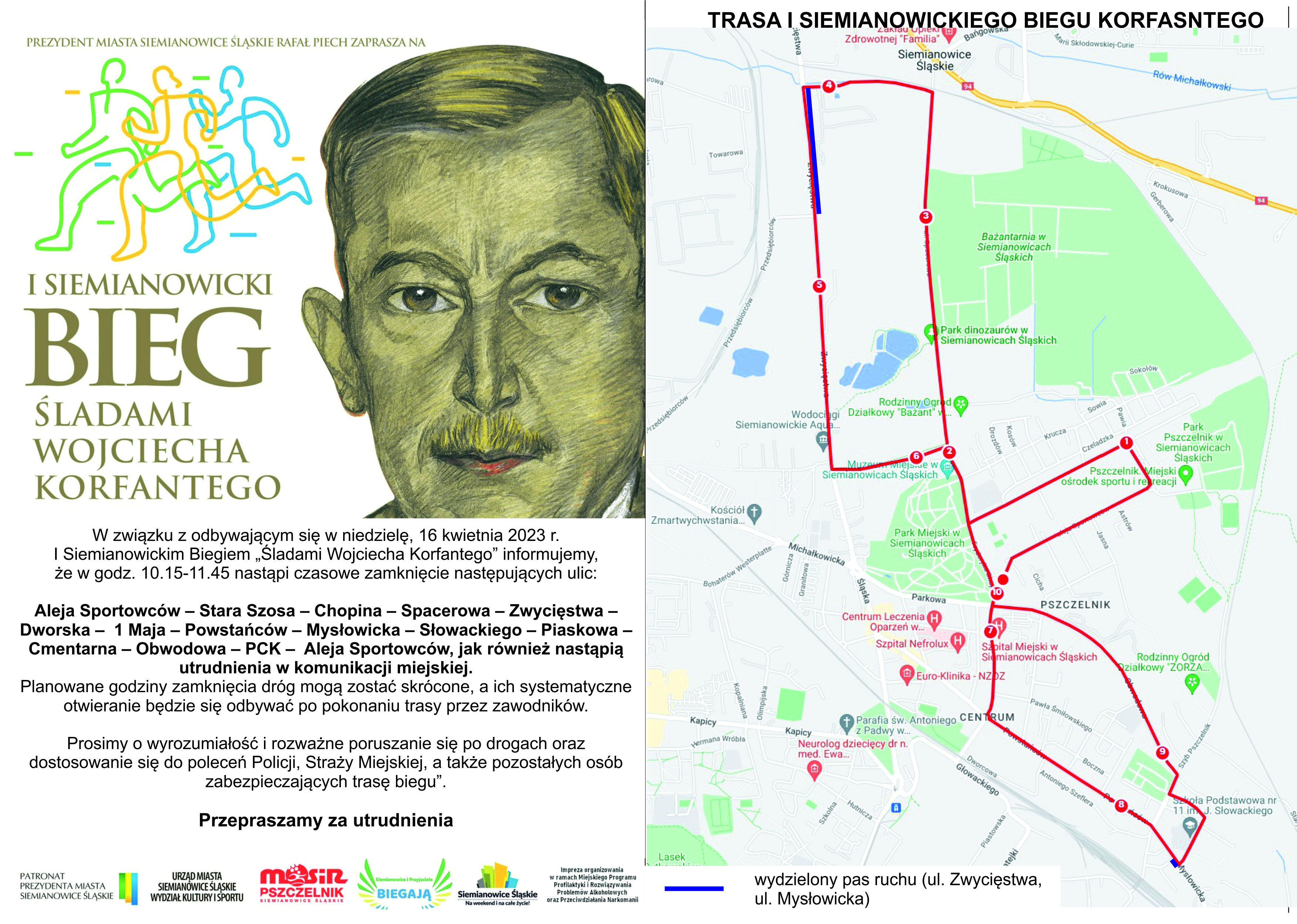 W związku z odbywającym się w niedzielę, 16 kwietnia 2023 r. I Siemianowickim Biegiem „Śladami Wojciecha Korfantego” informujemy, że w godz. 10.15-11.45 nastąpi czasowe zamknięcie następujących ulic: Aleja Sportowców – Stara Szosa – Chopina – Spacerowa – Zwycięstwa – Dworska – 1 Maja – Powstańców – Mysłowicka – Słowackiego – Piaskowa – Cmentarna – Obwodowa – PCK – Aleja Sportowców, jak również nastąpią utrudnienia w komunikacji miejskiej. Planowane godziny zamknięcia dróg mogą zostać skrócone, a ich systematyczne otwieranie będzie się odbywać po pokonaniu trasy przez zawodników. Organizator przeprasza za utrudnienia. Prosimy o wyrozumiałość i rozważne poruszanie się po drogach oraz dostosowanie się do poleceń Policji, Straży Miejskiej, a także pozostałych osób zabezpieczających trasę biegu”.