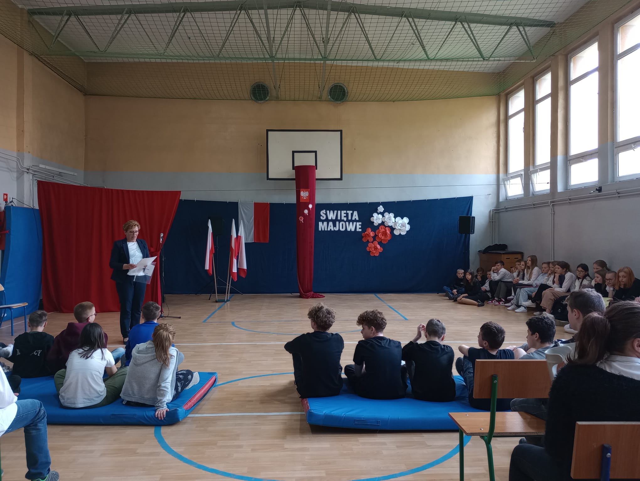 Akademię przygotowali uczniowie klasy 5b i 7a, którzy w rytm poloneza Wojciecha Kilara weszli na scenę, a następnie przybliżyli historię tego tak ważnego dla wszystkich Polaków Święta Narodowego. Recytowali fragmenty "Pana Tadeusza", wiersz Wisławy Szymborskiej oraz zaśpiewali piosenkę Jana Pietrzaka " Żeby Polska była Polską".