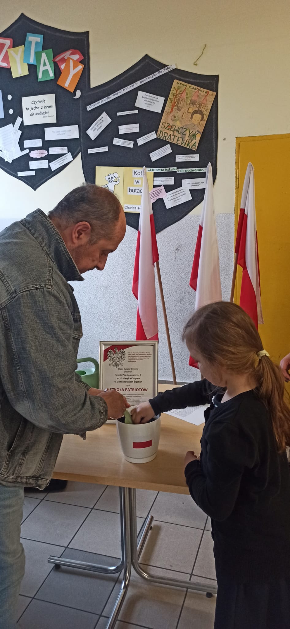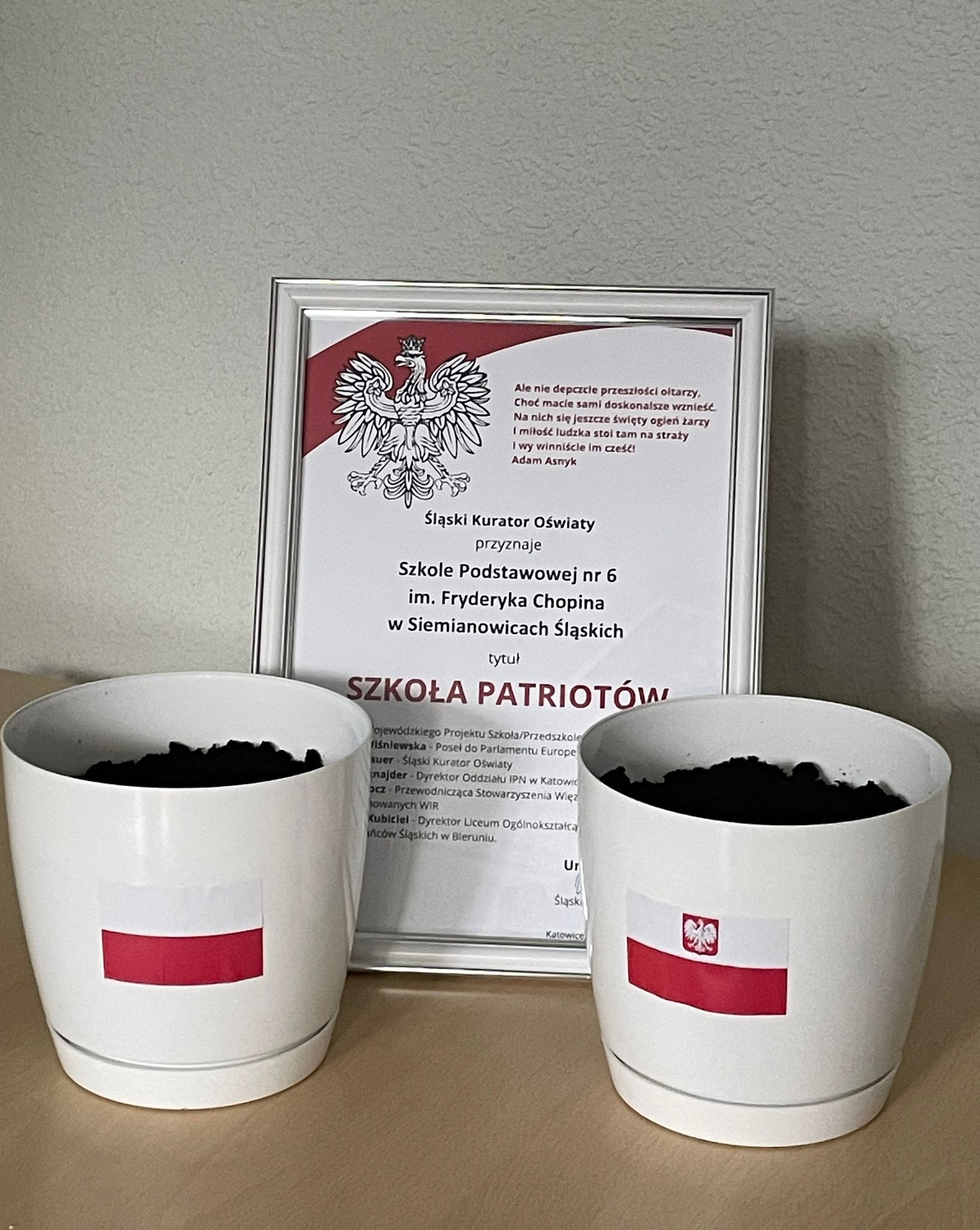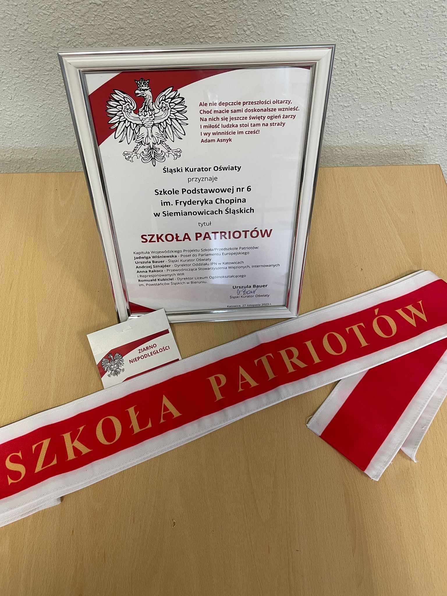 Z wielką radością i dumą chcemy podzielić się wiadomością, że zostaliśmy uroczyście uhonorowani za nasze zaangażowanie w Wojewódzkim Projekcie „Szkoła/Przedszkole Patriotów”. W dniu 27 listopada 2023 r. w Zespole Państwowych Szkół Muzycznych w Katowicach wręczono nam certyfikat, bandolierę oraz Ziarna Niepodległości za szereg przedsięwzięć zorganizowanych w szkole w związku z objęciem opieką grobu żołnierzy 75 Pułku Piechoty – Obrońców KWK "Michał".