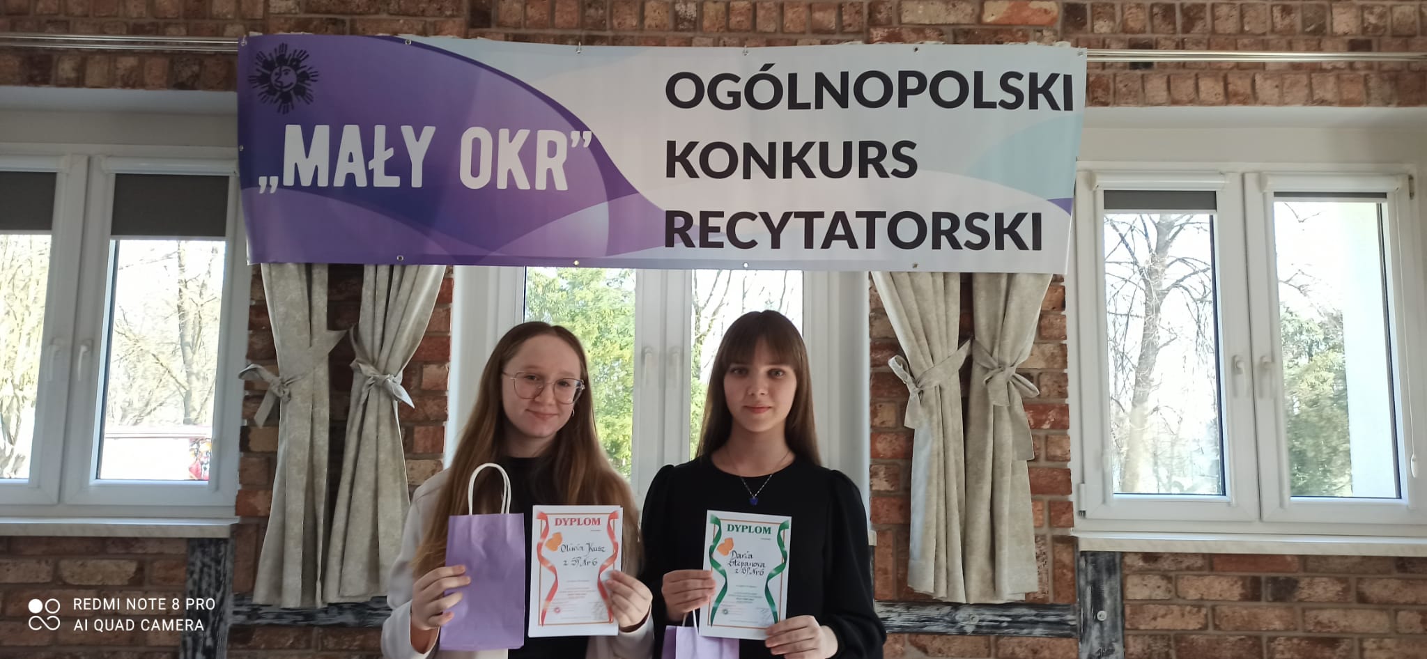 Daria Stepanova z klasy 8a i Oliwia Kusz z klasy 7a wzięły udział w Ogólnopolskim Konkursie Recytatorskim "Mały OKR". Przygotowały pod kierunkiem pani Jolanty Podkidacz wiersze Wisławy Szymborskiej i Adama Mickiewicza oraz fragmenty prozy Sławomira Mrożka. Swój repertuar zaprezentowały przed jury w Domu Kultury " Jordan" i zdobyły II i III miejsce. Gratulujemy i życzymy kolejnych sukcesów 👍👏🍀🌹
