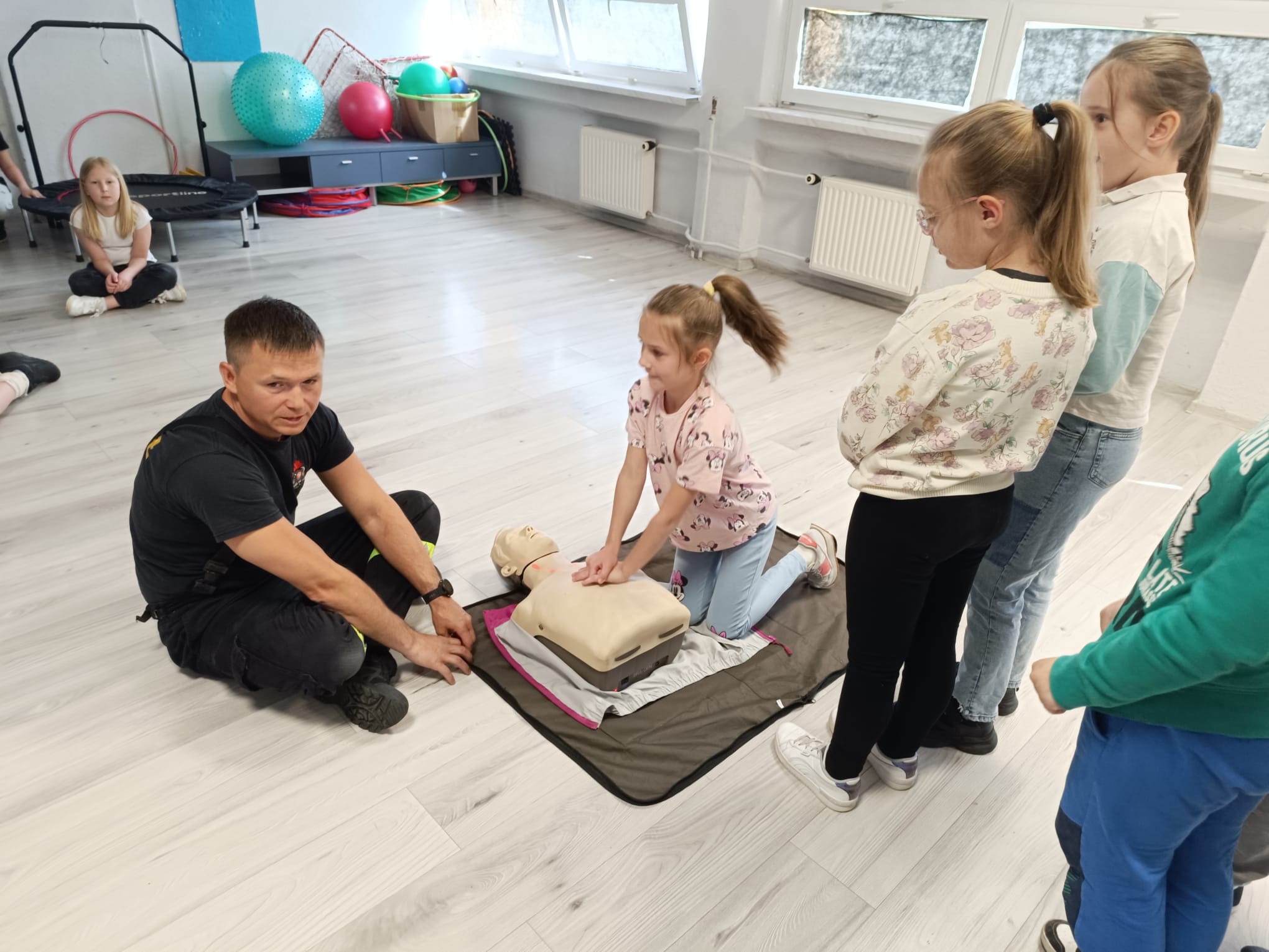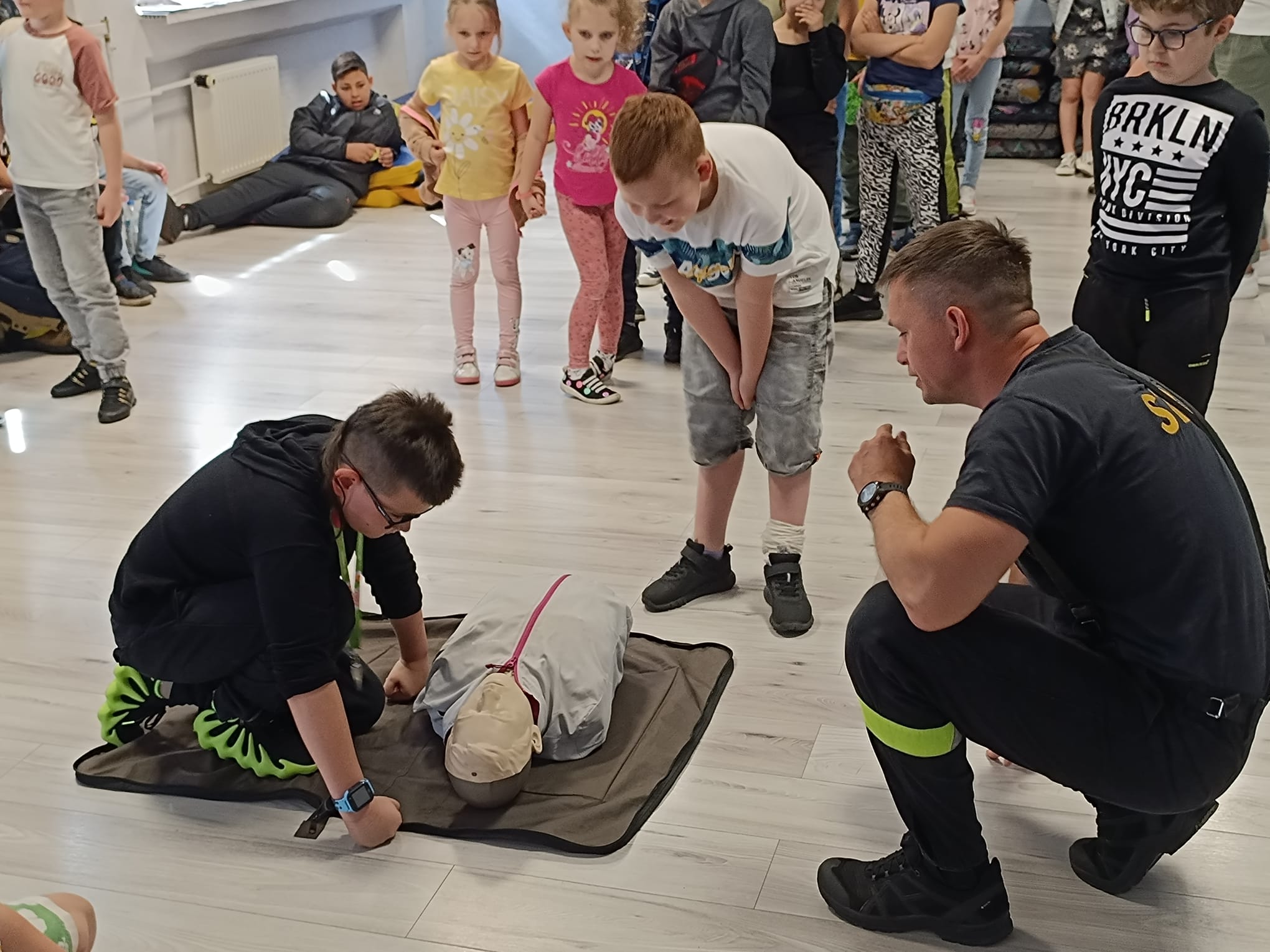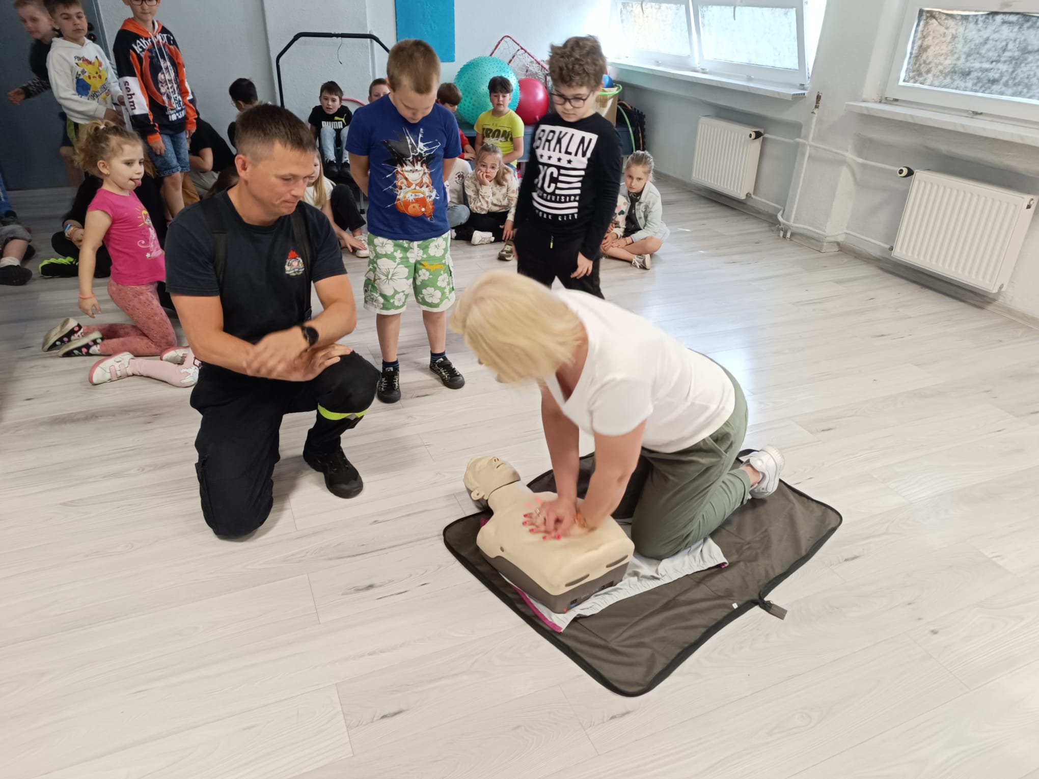 Klasy I-III naszej szkoły uczestniczyły w spotkaniu z Panem Krzysztofem Karasiem, strażakiem Komendy Miejskiej Państwowej Straży Pożarnej w Siemianowicach Śląskich. Nasz gość przybliżył uczniom podstawowe zasady udzielenia pierwszej pomocy przedmedycznej. Pomocnikami Pana Krzysztofa byli: Adą, Kacper i Tomek, nasi trzecioklasiści, którzy należą do Młodzieżowej Drużyny Pożarniczej Ochotniczej Straży Pożarnej w naszym mieście. Uczniowie zobaczyli prawidłowo przeprowadzoną resuscytację krążeniowo-oddechową, wspomaganą defibrylacją aparatem AED. Na fantomach mogli samodzielnie sprawdzić swoje umiejętności wykonania masażu serca. Następnie Uczniowie klas trzecich pod kierunkiem Pana Krzyśka uczyli się fachowo opatrywać krwawiące rany i usztywniać złamaną nogę. Wszyscy byli bardzo zadowoleni z dzisiejszego spotkania, za które bardzo dziękujemy Panu Krzysztofowi. W samo południe biliśmy rekord w jednoczesnej resuscytacji krążeniowo- oddechowej, akcji zorganizowanej przez Fundację WOŚP.