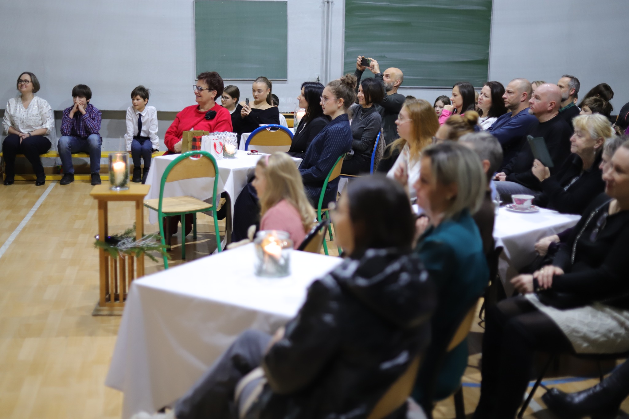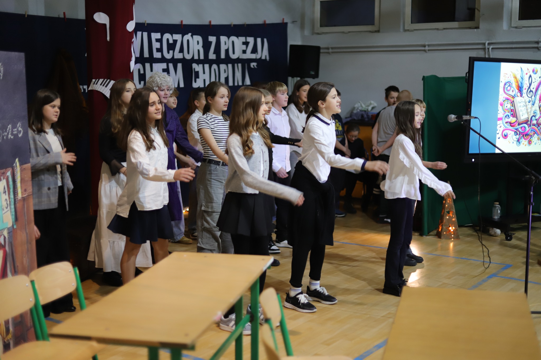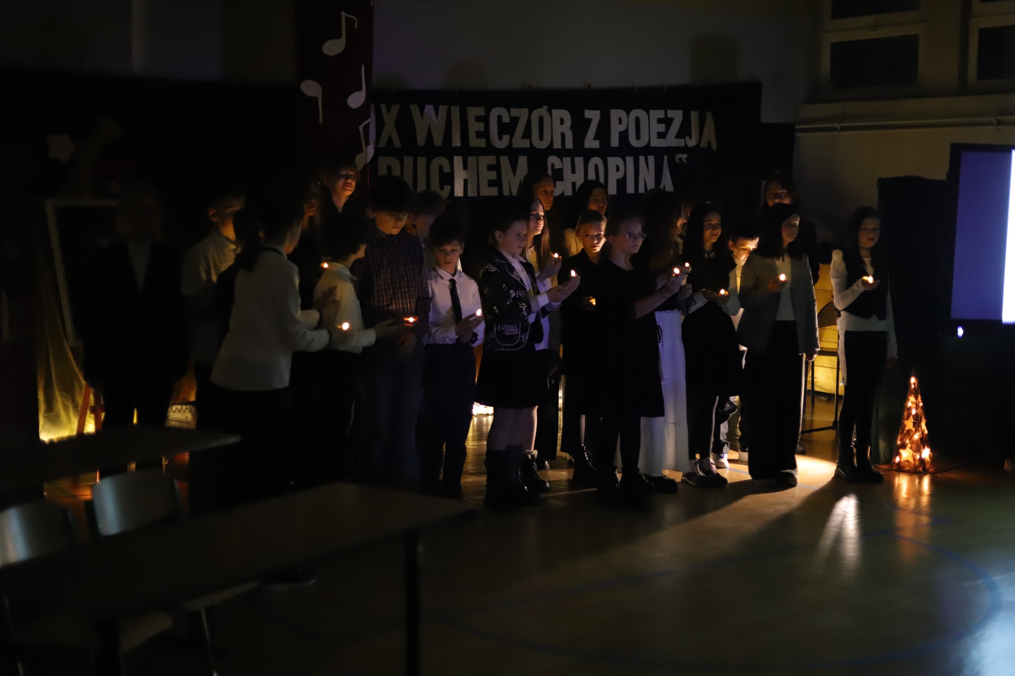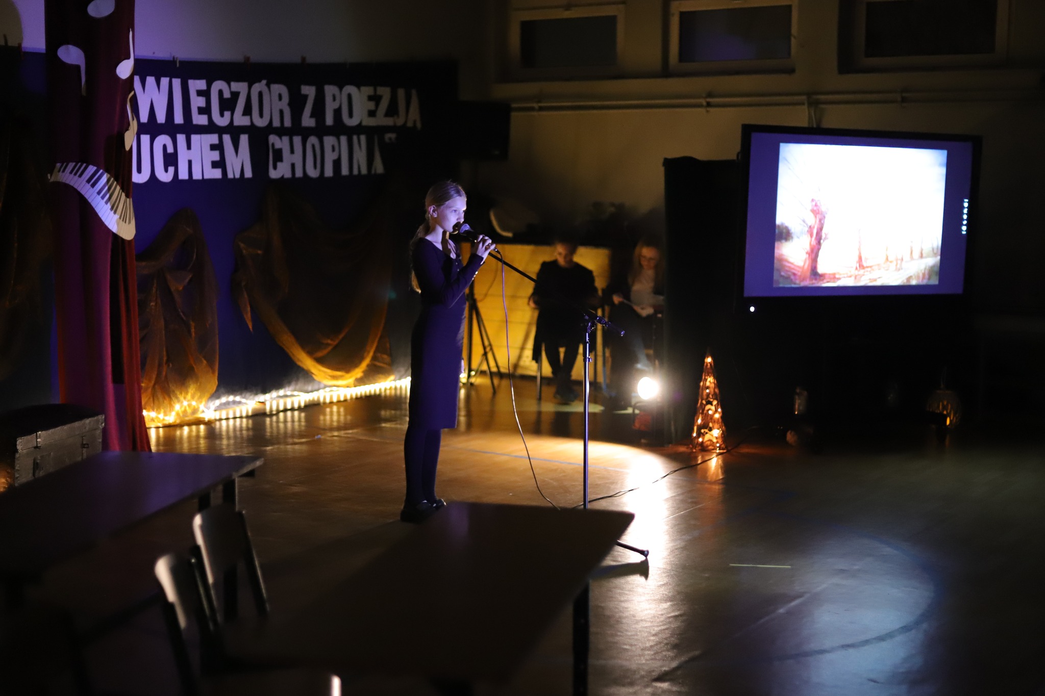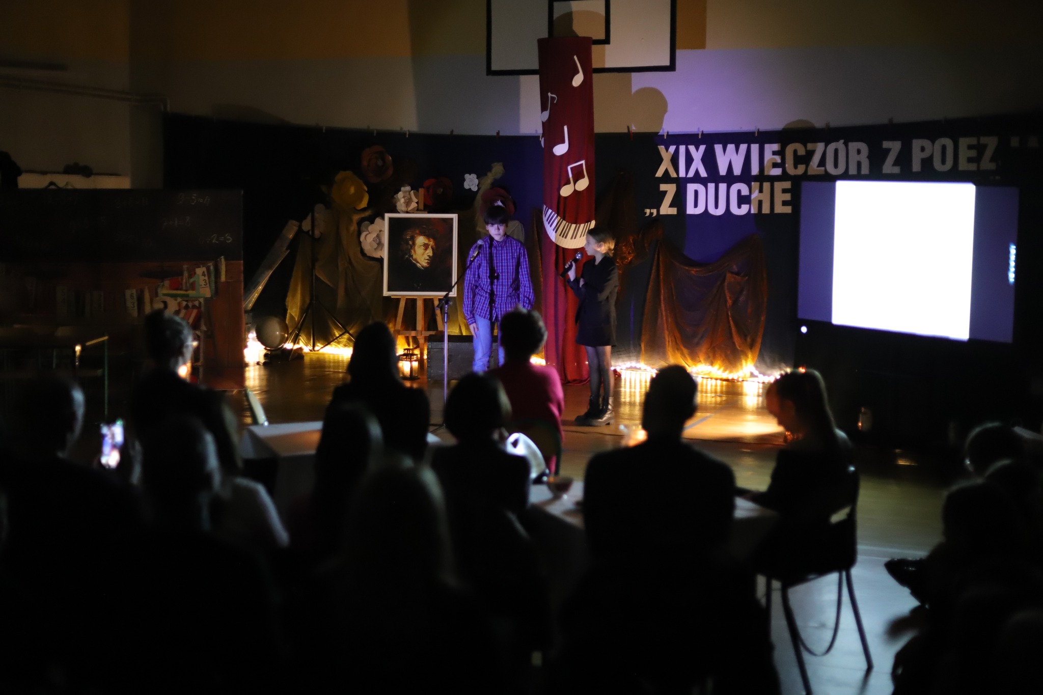 W drugiej części wieczoru cała sala zanurzyła się w dźwiękach muzyki Fryderyka Chopina, która w połączeniu z poezją poświęconą patronowi szkoły wprowadziła zebranych w romantyczny nastrój. Recytujący wiersze uczniowie oddali hołd wielkiemu kompozytorowi.