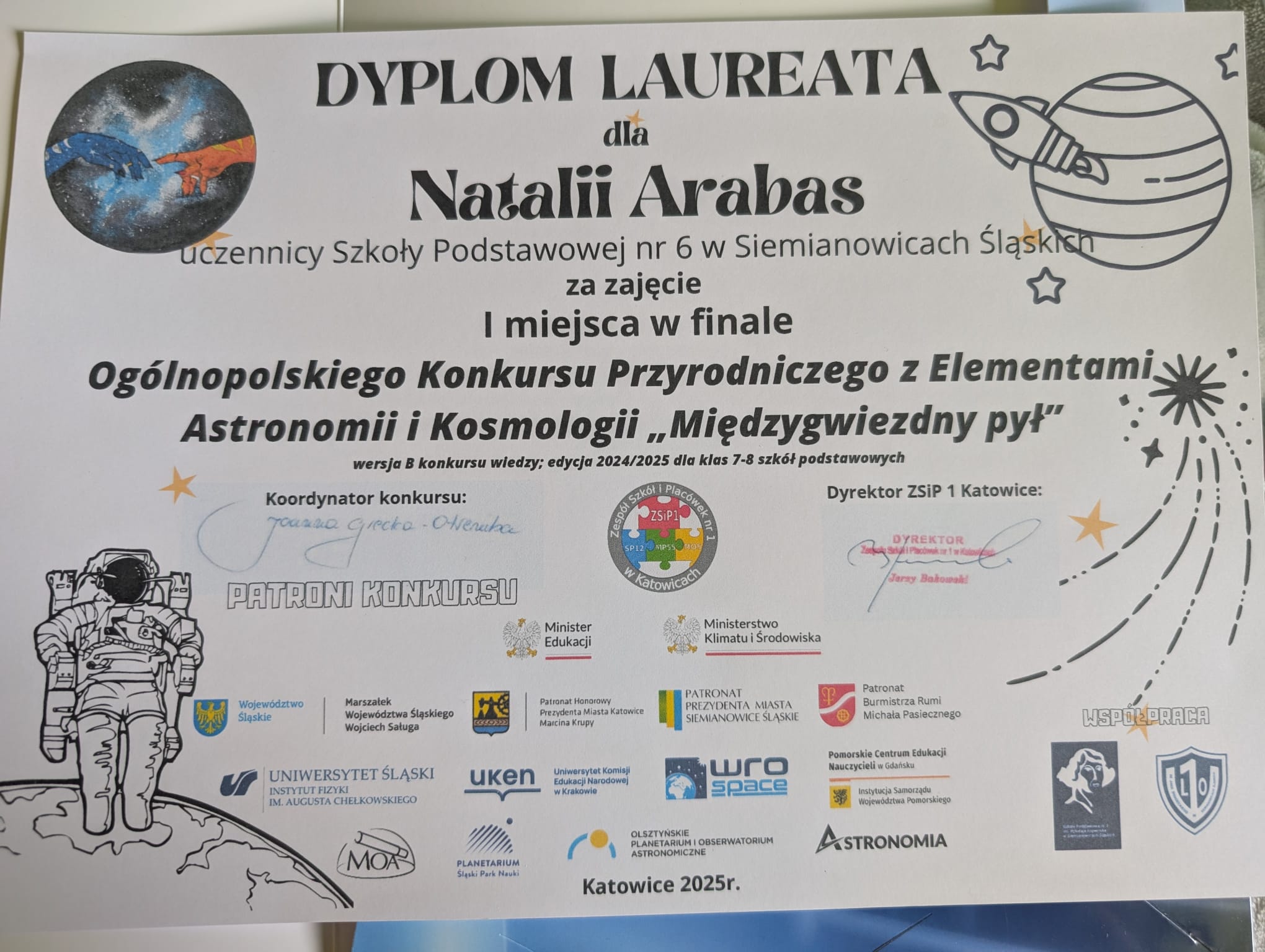 Uczennica klasy 8a- Natalia A. zdobyła I miejsce w finale ósmej edycji Ogólnopolskiego Konkursu Przyrodniczego z Elementami Astronomii i Kosmologii " Międzygwiezdny pył" w edycji 2024/2025 dla klas 7-8 szkół podstawowych. Uczennica wykonała wspaniałą pracę plastyczną, która zachwyciła jury. Tematem konkursu było wykonanie pracy plastycznej pt. "Między wiedzą a plastyczną wizją". Temat przewodni 2025 r. Promieniowanie i promieniotwórczość. Gratulujemy i życzymy Natalii dalszych sukcesów.