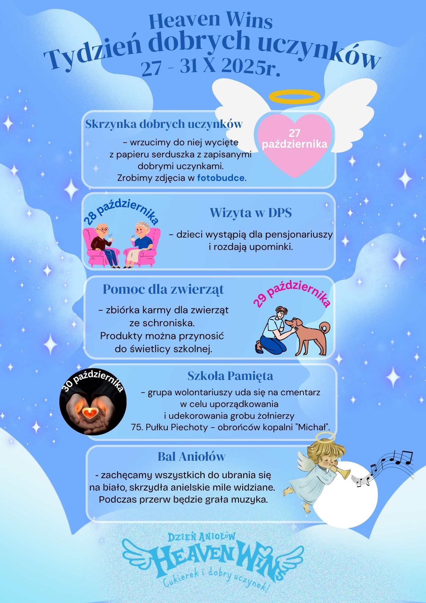Szkoła pamięta. Takie słowa towarzyszą obchodom kolejnego już dnia w tygodniu dobrych uczynków. Tym razem Szkolny Klub Wolontariatu udał się na cmentarz, aby uprzątnąć teren wokół grobu Żołnierzy 75 Pułku Piechoty - obrońców kopalni "Michał". Był to również doskonały moment na zadumę i zapalenie zniczy w hołdzie poległym żołnierzom.
