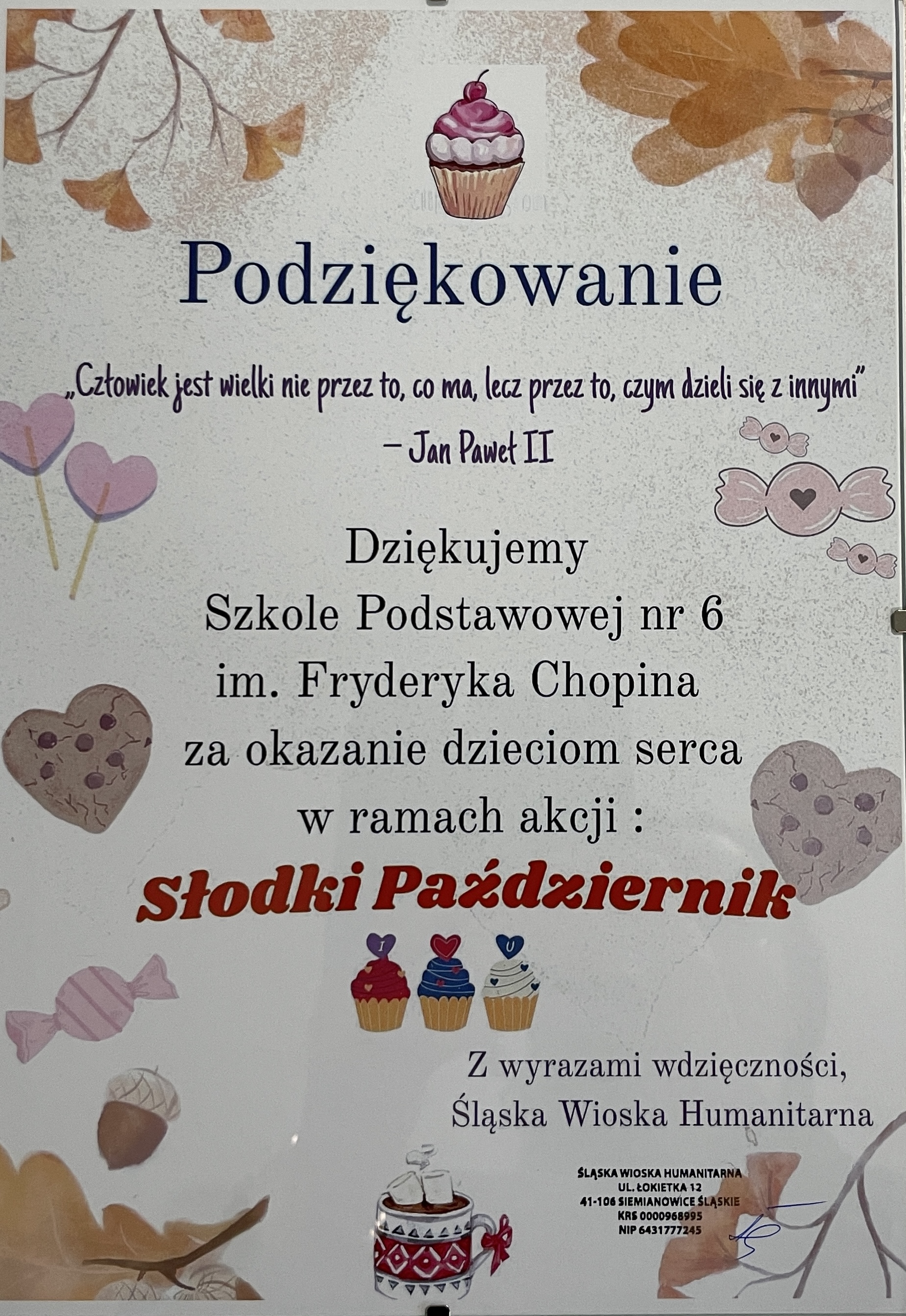 Sie pomaga! Dobiegła końca akcja "Słodki październik". Wzięła w niej udział społeczność naszej szkoły. Dzisiaj przekazaliśmy zebrane słodycze. Bardzo dziękujemy wszystkim, którzy włączyli się w zbiórkę słodyczy.